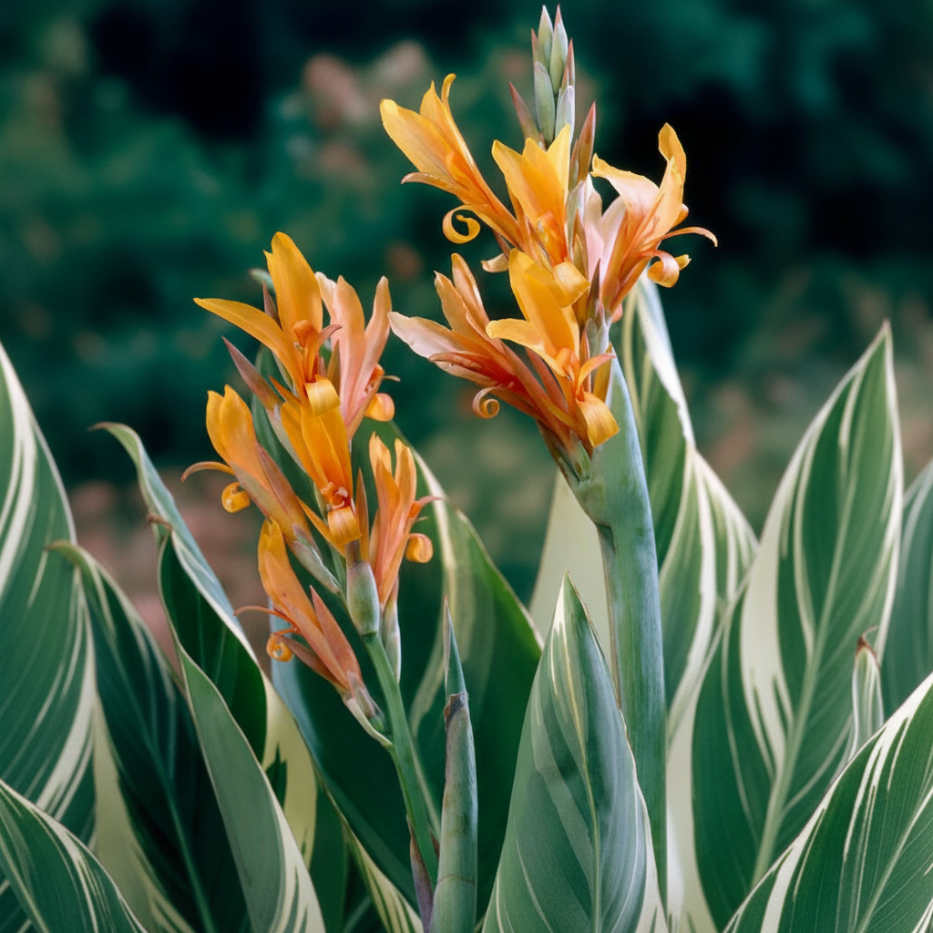 Kanna ar gaišām raibām lapām un oranžiem ziediem.