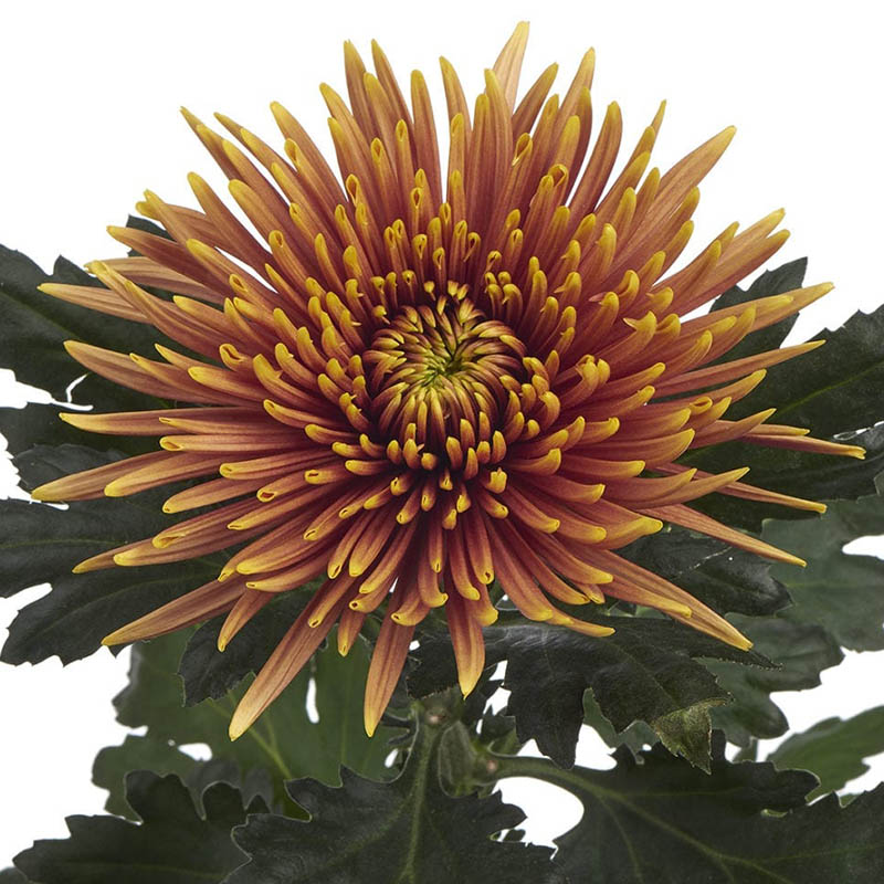 Lielziedu krizantēma grieztiem ziediem siltumnīcā. Zied 44. - 47. nedēļā. Zirnekļveida ziedi. Reakcijas laiks - 8 nedēļas.