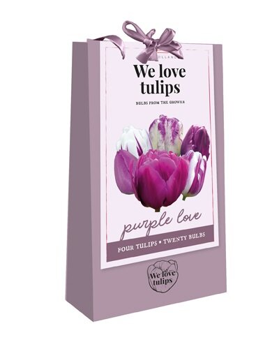 Dāvanu iepakojums ar 20 dažādām tulpēm purpura un baltas krāsas ietvaros. Tulpju maisījums īpaši skaistā iepakojumā, gatavs dāvināšanai. Augstums 45 cm.Vienā iepakojumā ir 20 sīpoli.